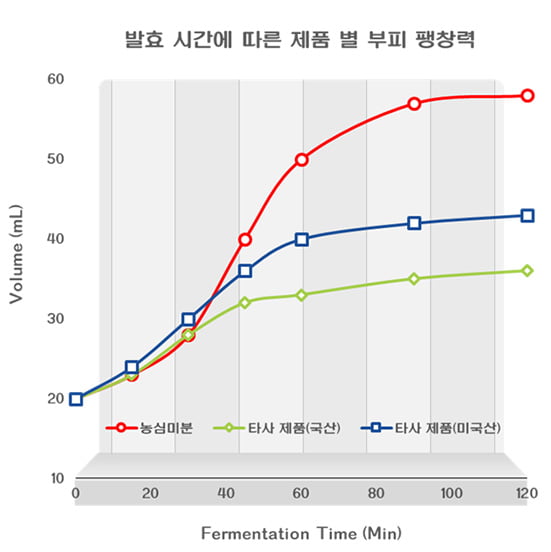 타사 제품과 비교 테스트를 통해 우수한 볼륨감(팽창력)을 갖추어 글루텐 프리 전용분의 단점을 보완하였습니다.